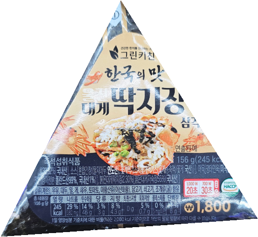 심각김밥과 도시락 등은 편의점 음식의 대표라고 해도 손색이 없을 것이다. 특히 삼각김밥, 도시락, 일반김밥 등은 제품유통 사이클이 매우 짧다. 그야말로 신제품이 주기별로 나오고 있다. 특히 삼각김밥 등은 출근시 직장인들은 전자레인지에 30초만 데우면 딱 먹기 좋은 음식으로 변한다. 거기에다 영양이 있는 음료 한잔까지 곁들이면 점심때까지는 든든하다. 요즘 가장 인기 있는 제품 등 하나가 대게딱지장이다.